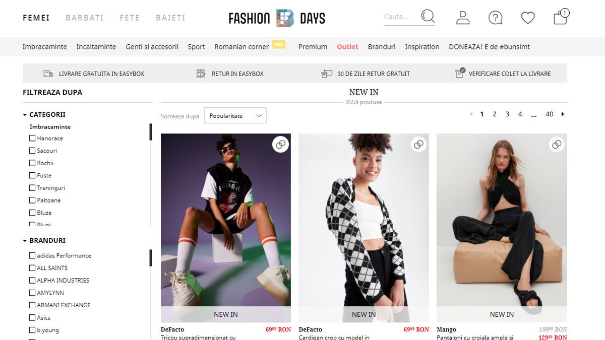 Fashion Days e destinatia online ce ofera shopping si inspiratie, oriunde si oricand, celor peste 1.500.000 de clienti din Romania, Bulgaria si Ungaria. Portofoliul include numeroase branduri de mall, dar si branduri premium, accesibile direct de pe telefon: Calvin Klein, Converse, Diesel, Esprit, Fossil, GAP, Guess, Karl Lagerfeld, Liu Jo, Love Moschino, Mango, New Balance, Nike, Pepe Jeans London, Puma, Skechers, Tommy Hilfiger, U.S. Polo Assn., UGG, Under Armour, Ted Baker, Gant, Emporio Armani, Furla, Timberland, Napapijri si multe altele.